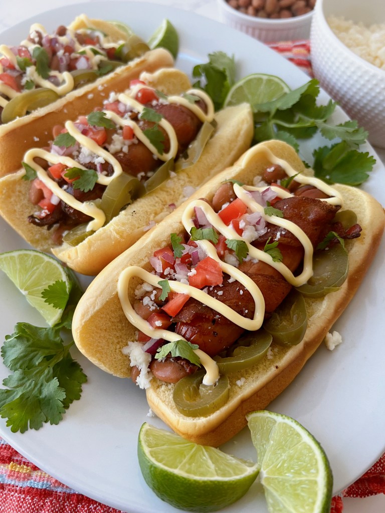 Fun little story: my husband was the first person I ever met who put mayonnaise on hot dogs. My family and I thought it was so weird and it was an ongoing joke between us for years. My dad even mentioned it in his speech at our wedding. Now, however, I actually really like mayo on hot dogs and it has opened up a new world of obscure hot dog toppings for me. All of this to say: when I was researching what to make for Arizona and came across the Sonoran dog, I knew I had to make it.