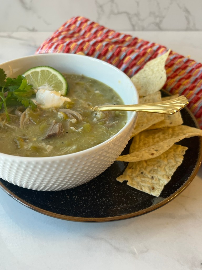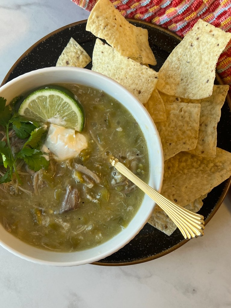 Since it wasn’t my first rodeo with making green chili, I really took the time to try and make it perfect — or as perfect as anything made in a twenty-something’s home kitchen in her rental townhome can get. Thankfully I already had some chopped, roasted chilis from the fondue (I just made extra — thinking ahead like the girl genius I am), and I got good quality pork shoulder from a local butcher. I seasoned the pork liberally with salt and pepper and seared it on all sides over high heat to get a really nice crust on it. Then braised it in the oven for about 3-4 hours with some chicken broth and warm spices (cumin, paprika, etc) until it was tender and falling apart. Some versions of green chili keep the pork in large cubes, but I wanted to shred it this time for reasons you will read about later in this post if you decide to keep going.