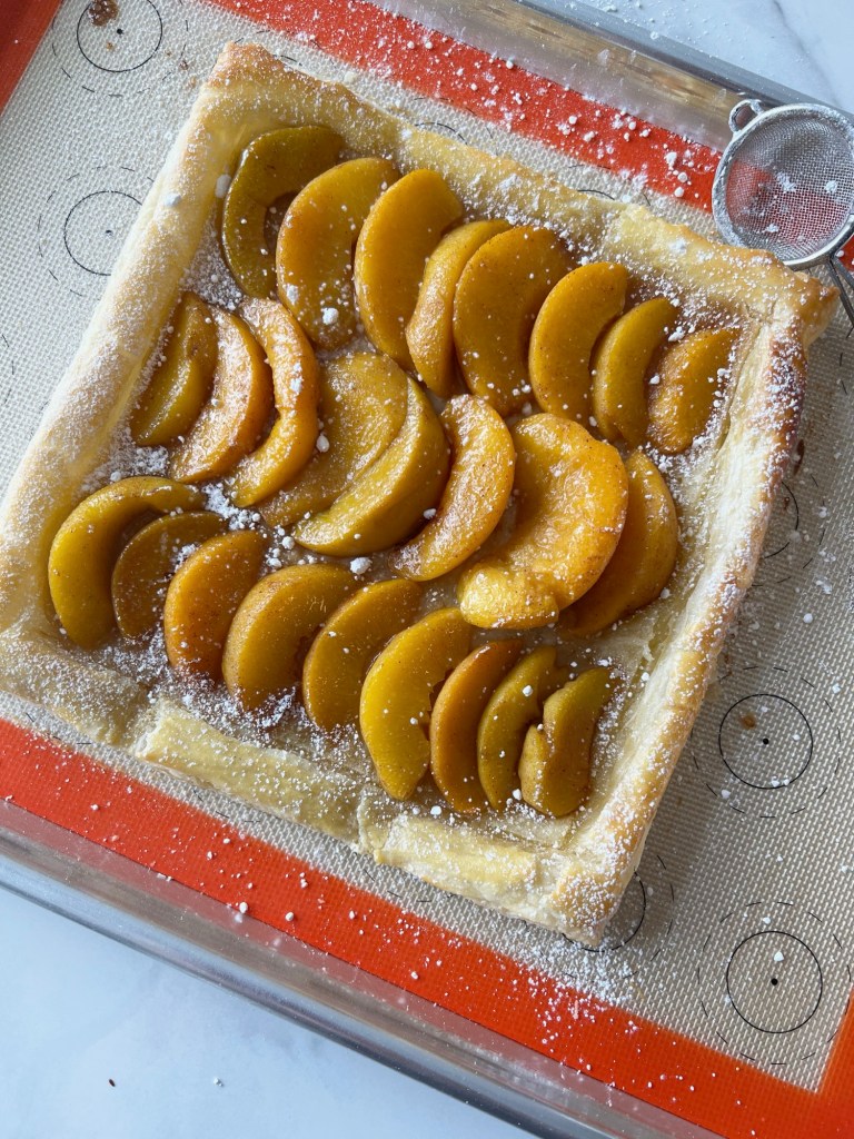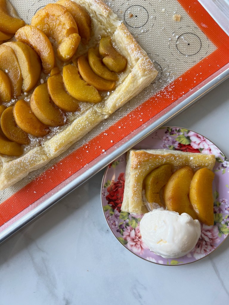 For dessert, I made a “Palisade” peach tart but with peaches I bought from a Publix in Alabama. Colorado is famous for their Palisade peaches. The high altitude and drastic changes in temperature make for extra sweet and juicy peaches. The high temperatures during the day help build the flavor in the peaches, and the cold temperatures at night help retain it.