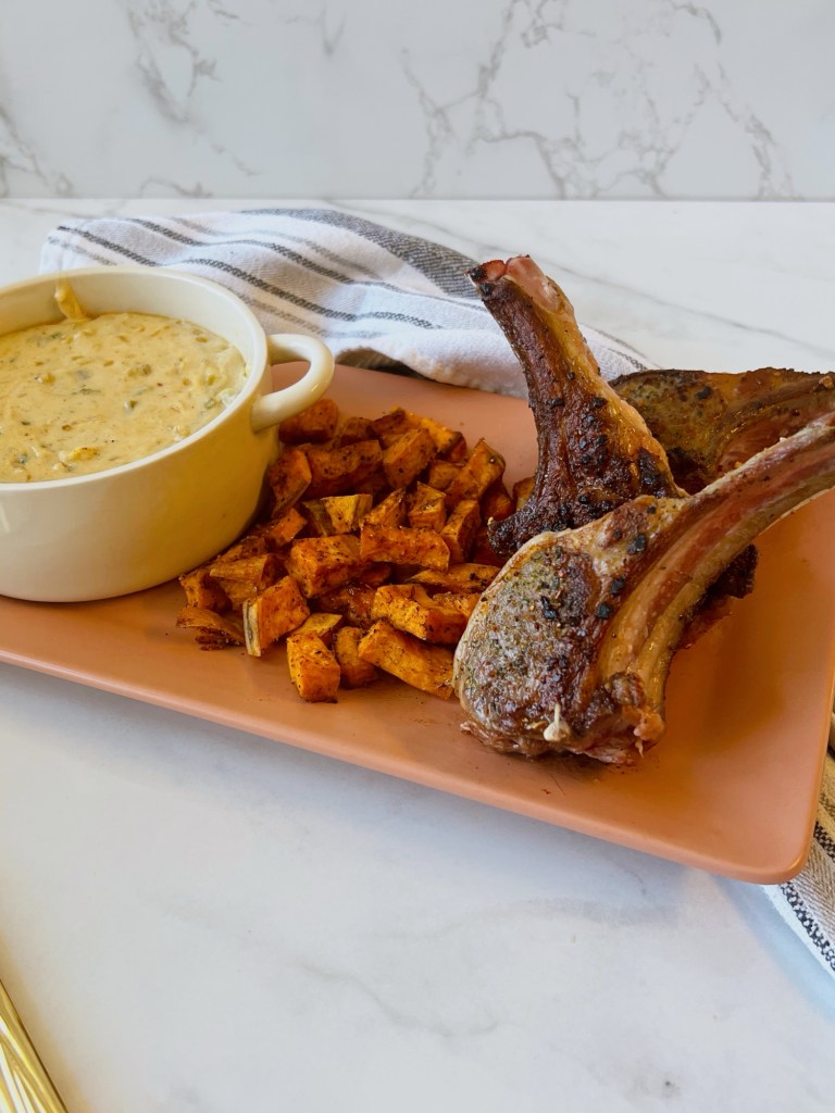 The dish is made with lamb chop lollipops and served with roasted sweet potatoes alongside the green chili fondue. Fondue is everything correct in this world, and I was so excited about making this.