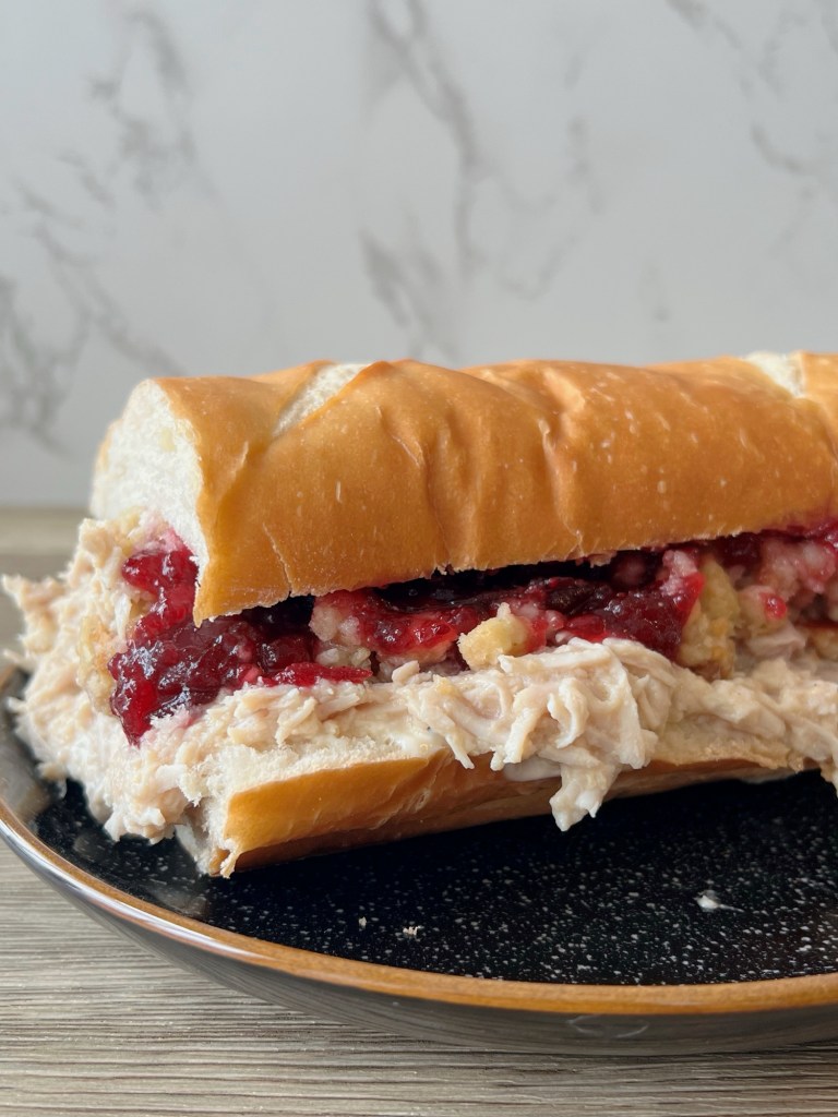 The Bobbie is a Delaware institution thanks to the iconic Capriotti’s Sandwich Shop. It contains roasted turkey, stuffing, cranberry sauce and mayo. I didn’t roast my turkey because I didn’t want to commit to buying a whole breast, so I slow cooked some turkey tenderloins in gravy and that was clearly the right move, even if the result looks like slop. I just did a quick stuffing of dried bread cubes, sautéed bell pepper, celery, and onion, dried herbs, and enough chicken broth to make it a wet, crumbly texture. You know, like, stuffing. Then I used canned cranberry sauce because it just doesn’t get better than that.